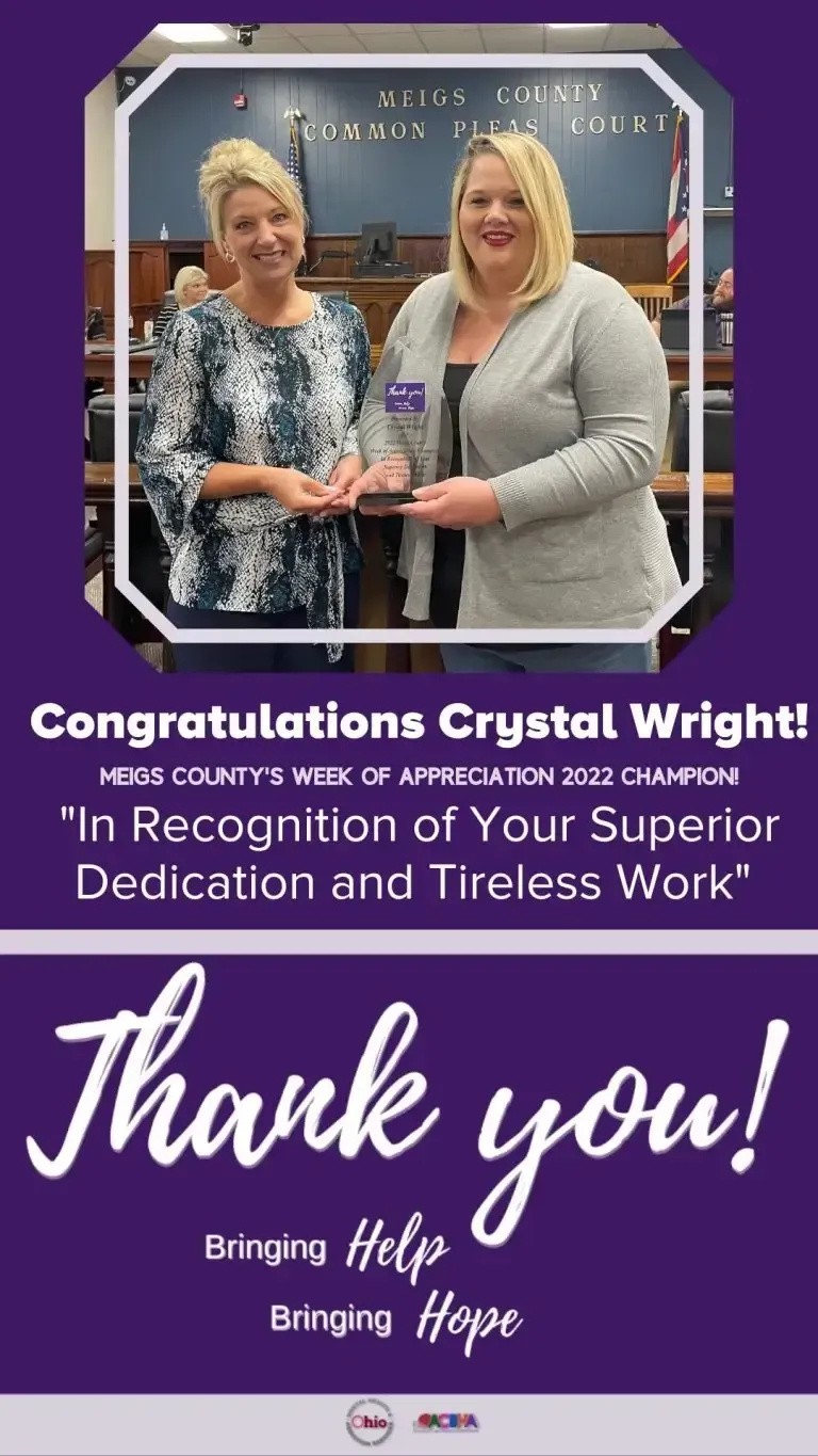 Recognizing that the work of a “Champion” can be both heart-wrenching and thankless, we are proud to present the 2023 Meigs County Champion, to Destiny Dotson, “In Recognition of Your Superior Dedication and Tireless Work”
