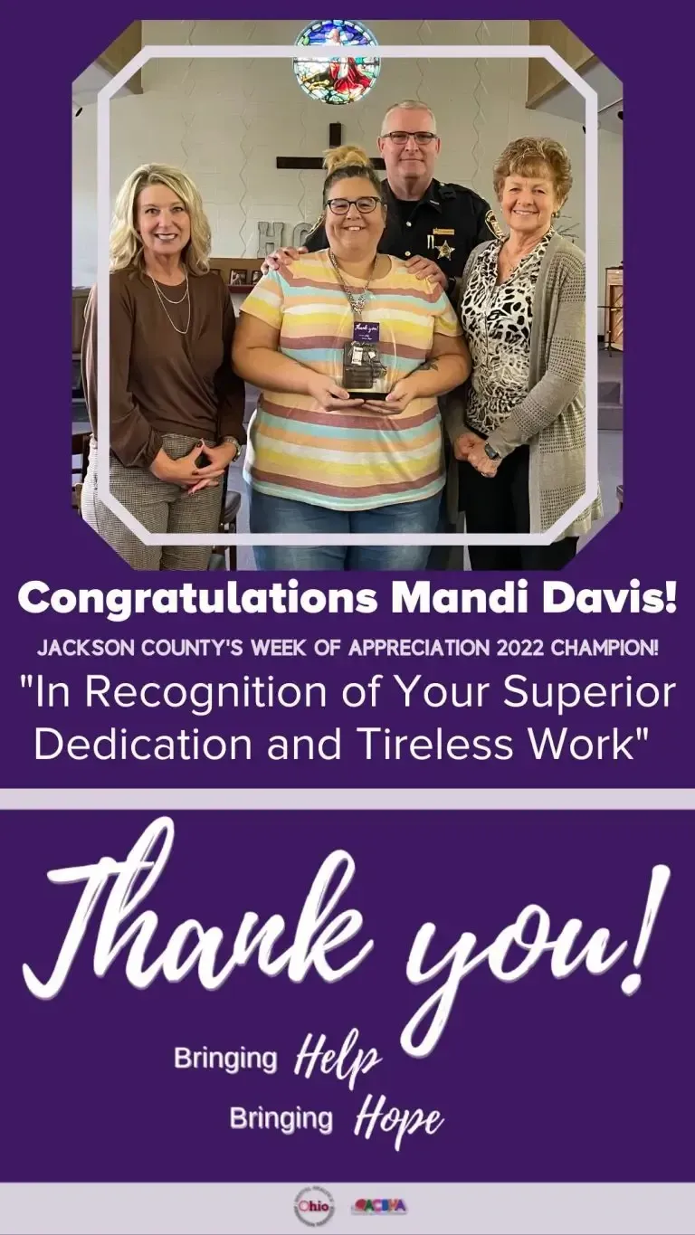 Recognizing that the work of a “Champion” can be both heart-wrenching and thankless, we are proud to present the 2023 Gallia County Champion, to Amber Richards, “In Recognition of Your Superior Dedication and Tireless Work”